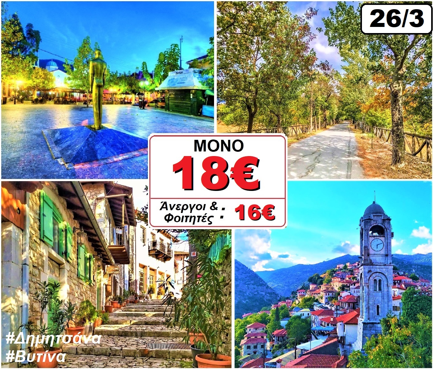 Tο Σάββατο 26/3 αναχωρούμε στις 8:00 ακριβώς από το μετρό του Ελαιώνα (Ιερά Οδό). Με την απαραίτητη ενδιάμεση στάση, άφιξη στην πανέμορφη ΔΗΜΗΤΣΑΝΑ! Από τα ομορφότερα και πιο καλοδιατηρημένα χωριά της ορεινής Αρκαδίας, με μοναδική αρχιτεκτονική, ατμοσφαιρικούς ξενώνες, εντυπωσιακά μοναστήρια, το φαράγγι του Λούσιου και το ελατοσκέπαστο Μαίναλο σε απόσταση αναπνοής, η Δημητσάνα αποτελεί εδώ και χρόνια μια από τις δημοφιλέστερες βάσεις για διαφορετικά είδη τουρισμού.
