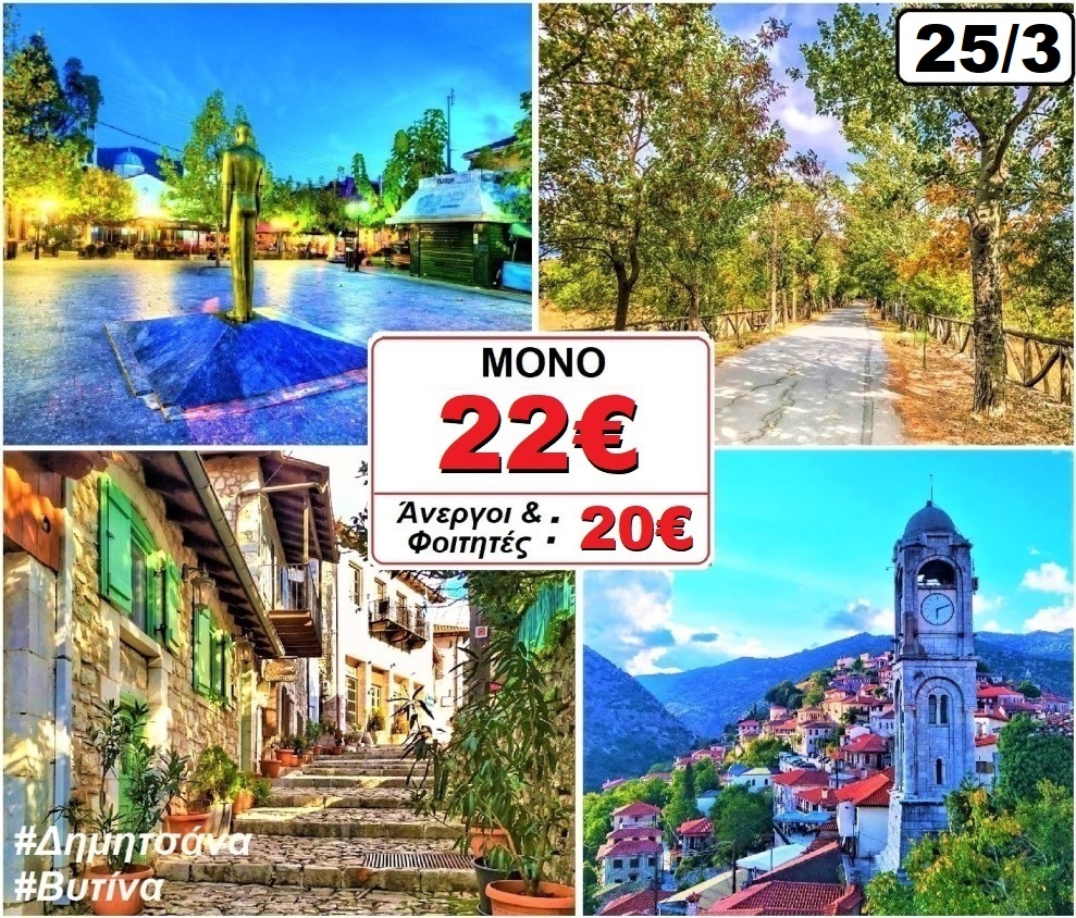 Tο Σάββατο 25/3 αναχωρούμε στις 8:00 ακριβώς από το μετρό του Ελαιώνα (Ιερά Οδό). Με την απαραίτητη ενδιάμεση στάση, άφιξη στην πανέμορφη ΔΗΜΗΤΣΑΝΑ! Από τα ομορφότερα και πιο καλοδιατηρημένα χωριά της ορεινής Αρκαδίας, με μοναδική αρχιτεκτονική, ατμοσφαιρικούς ξενώνες, εντυπωσιακά μοναστήρια, το φαράγγι του Λούσιου και το ελατοσκέπαστο Μαίναλο σε απόσταση αναπνοής, η Δημητσάνα αποτελεί εδώ και χρόνια μια από τις δημοφιλέστερες βάσεις για διαφορετικά είδη τουρισμού.