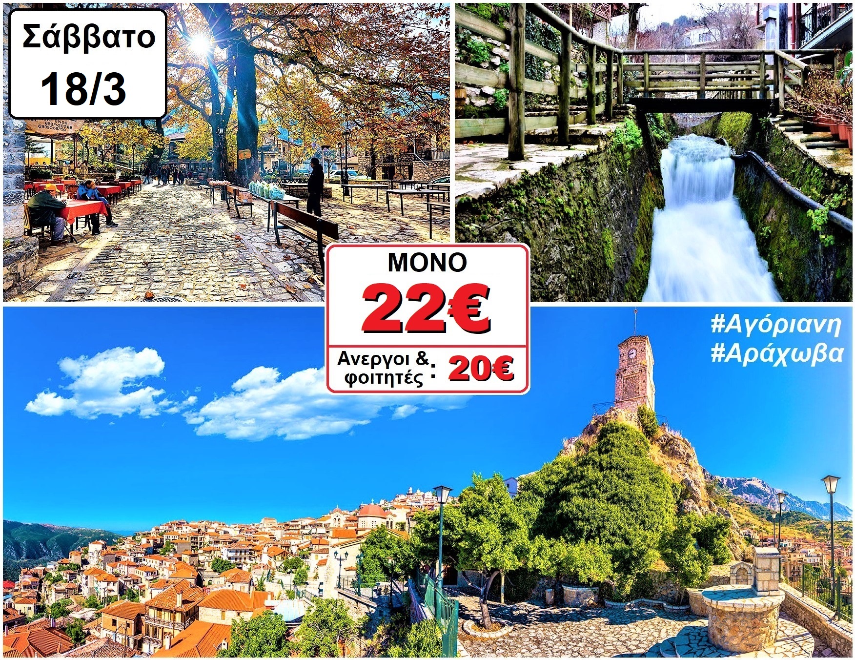 Το Σάββατο 18/3, αναχωρούμε ακριβώς στις 8:00 το πρωί από το μετρό του Ελαιώνα(Ιερά οδό). Με ενδιάμεση στάση, φτάνουμε στην Αγόριανη, ή αλλιώς “Επτάλοφος”. Ορεινή γοητεία, πετρόχτιστα σπιτάκια με κεραμοσκεπές, μια κλασική πλακόστρωτη πλατεία με αιωνόβια πλατάνια και γλυκύτατα καφενεία, και τα απαραίτητα μονοπάτια που οδηγούν σε φυσικές ομορφιές είναι τα ατού του χωριού. Το πετρόχτιστο μονοπάτι που ξεκινά από την πλατεία θα μας οδηγήσει, ακολουθώντας το ποταμάκι, σε έναν υπέροχο καταρράκτη!