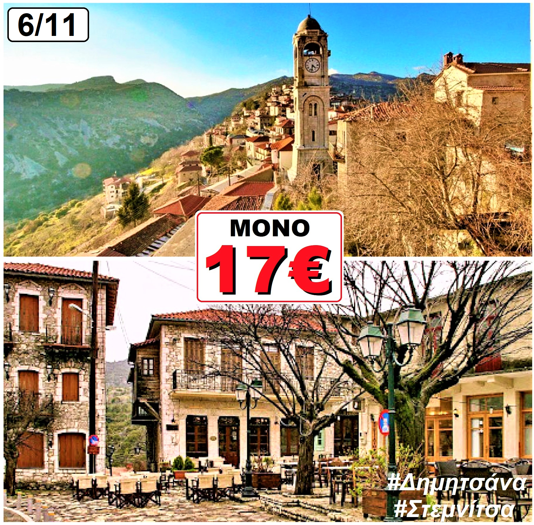 Tο Σάββατο 6/11 αναχωρούμε στις 8:00 ακριβώς από Αθήνα. Με ενδιάμεση σύντομη στάση για καφέ, ανηφορίζουμε για τα χωριά της Αρκαδίας! Πρώτη μας επίσκεψη στην υπέροχη ΣΤΕΜΝΙΤΣΑ! Επιβλητικά πυργόσπιτα με τοξωτά υπέρθυρα, πέτρινα καλντερίμια που ανηφορίζουν περνώντας κάτω από τις καμάρες των σπιτιών και χάνονται μέσα στις καρυδιές και τις κερασιές, κεφαλόβρυσα στη σκιά αιωνόβιων πλατάνων και μια ζωντανή πλατεία γεμάτη καφενεία και ταβέρνες συνθέτουν ένα από τα επίσης ομορφότερα χωριά της Αρκαδίας!
